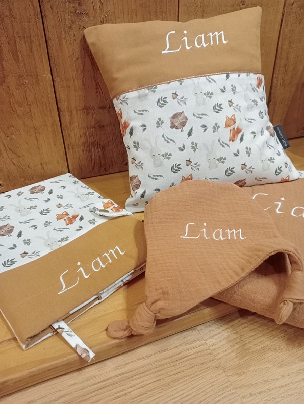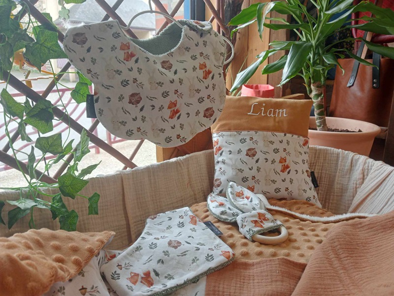 Choisissez vos tissus, personnalisez des accessoires avec le prénom de bébé.